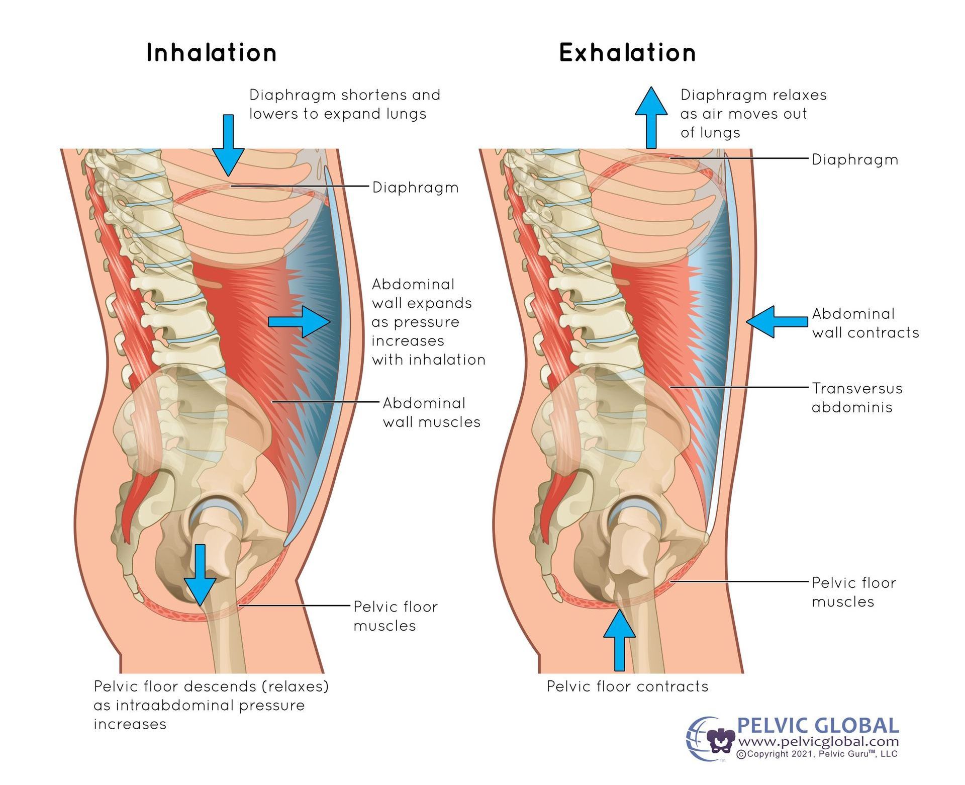 breathe out (right), the diaphragm relaxes to lift up, the abdominal wall and pelvic floor muscles shorten to return to their resting positions.