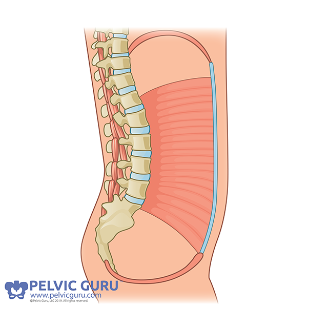 The graphic below helps to show that the diaphragm makes the top or ceiling, the abdominal muscles create the walls to the abdomen, and the pelvic muscles create the floor to contain all of our abdominal contents. As we breathe in, the diaphragm will lower down increasing the pressure in the belly.